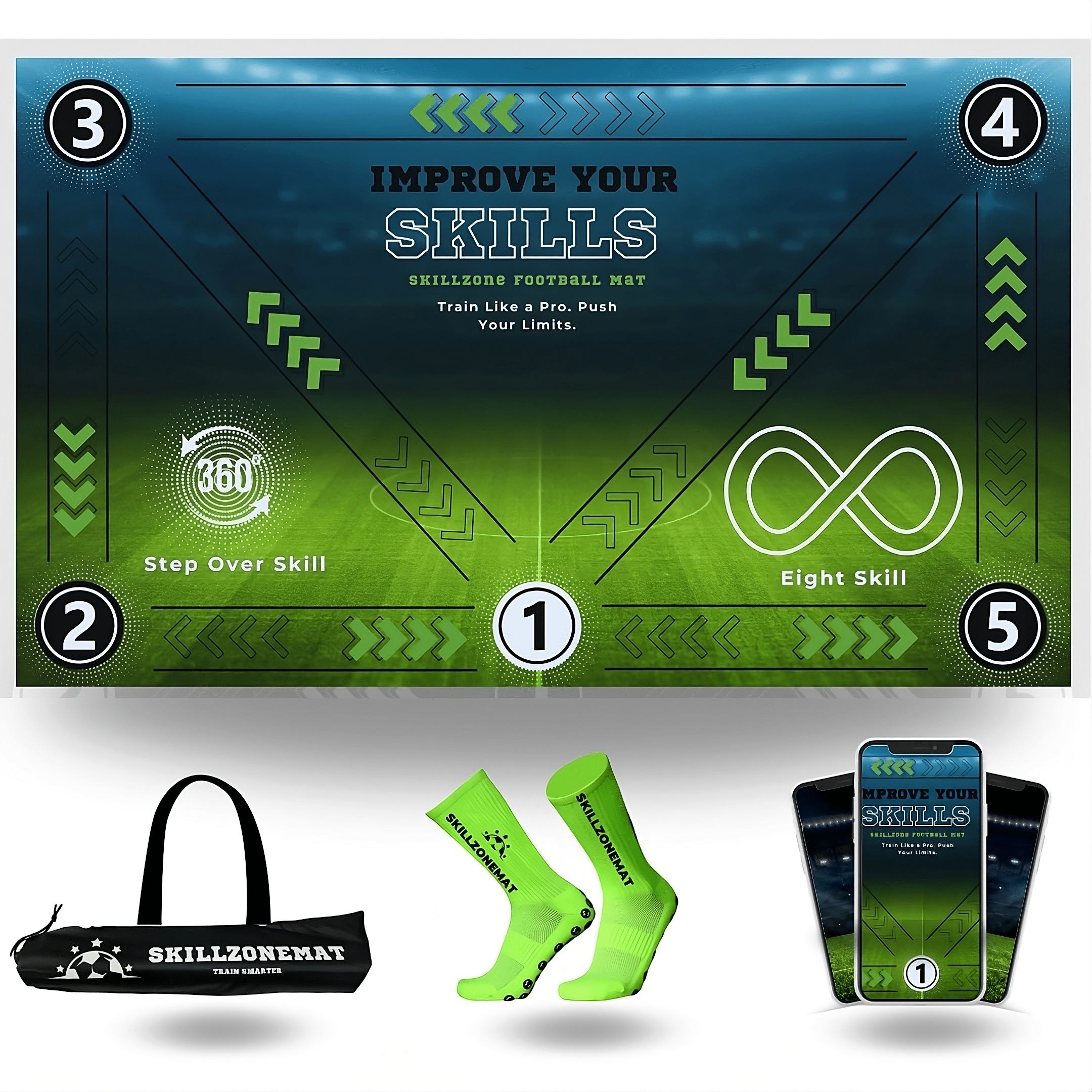 Elevate your soccer training with the SkillZone Sky Speed Mat, designed for players focused on agility and quick footwork. Featuring an ultra-thick, extra-wide surface for unmatched comfort and stability, this mat ensures every drill is seamless. The included professional-grade yellow grip socks maximize performance, while the non-slip design keeps your movements precise. Pack it all in the stylish carry bag for easy portability and access exclusive video tutorials to perfect your skills anytime, anywhere.
